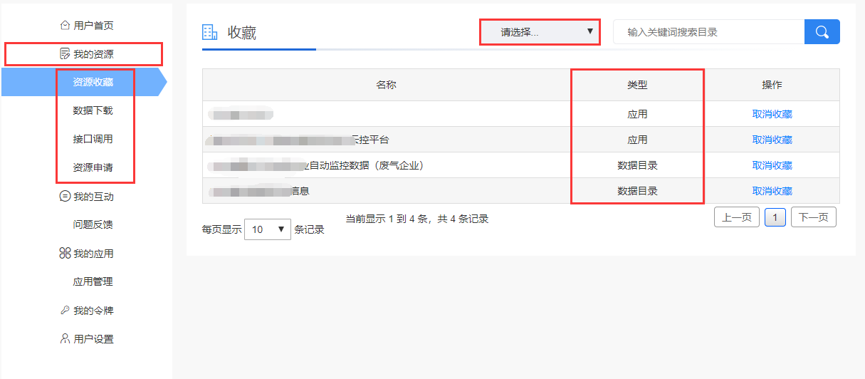 用户在浏览和使用开放网站过程中收藏的数据集、API、以及应用,都可以在 资源收藏 菜单下进行查看。上方的下拉框可对收藏中的内容类型进行筛选,内容类型包括应用、数据目录、API服务。